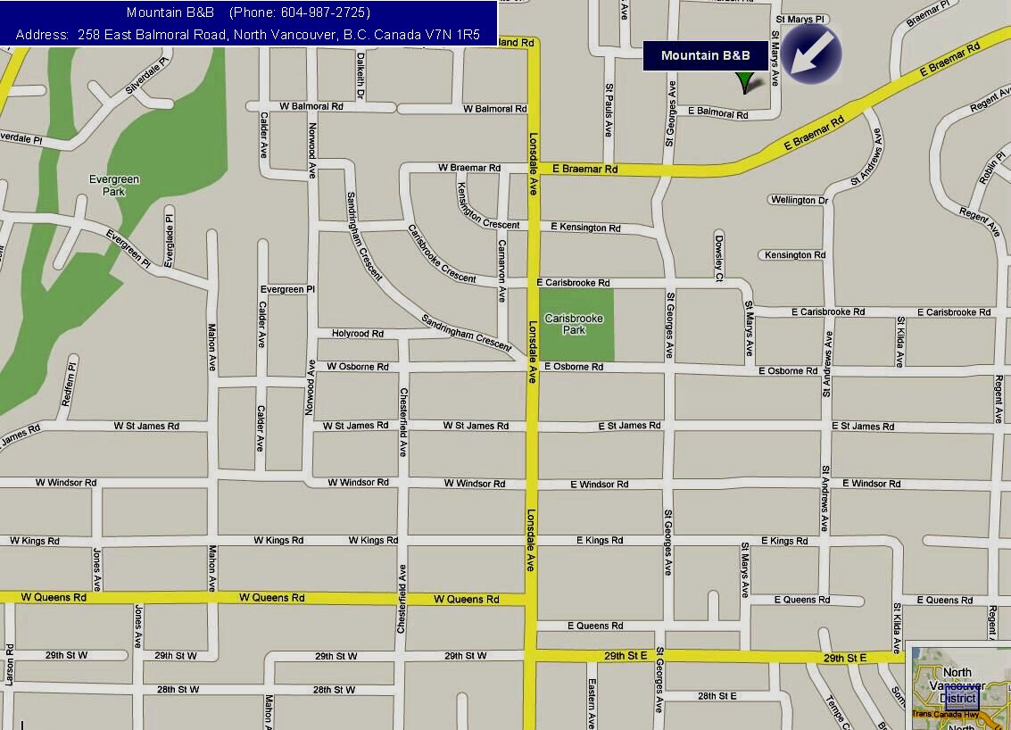 ![]() Located in beautiful North Vancouver, British Columbia, Mountain Bed and Breakfast is a clean, traditional home in a very quiet neighbourhood. Our comfortable accommodations feature rooms with queen and king beds, private baths, fireplace and a private suite with a jacuzzi tub. We are operating B&B 20th year since 1986.